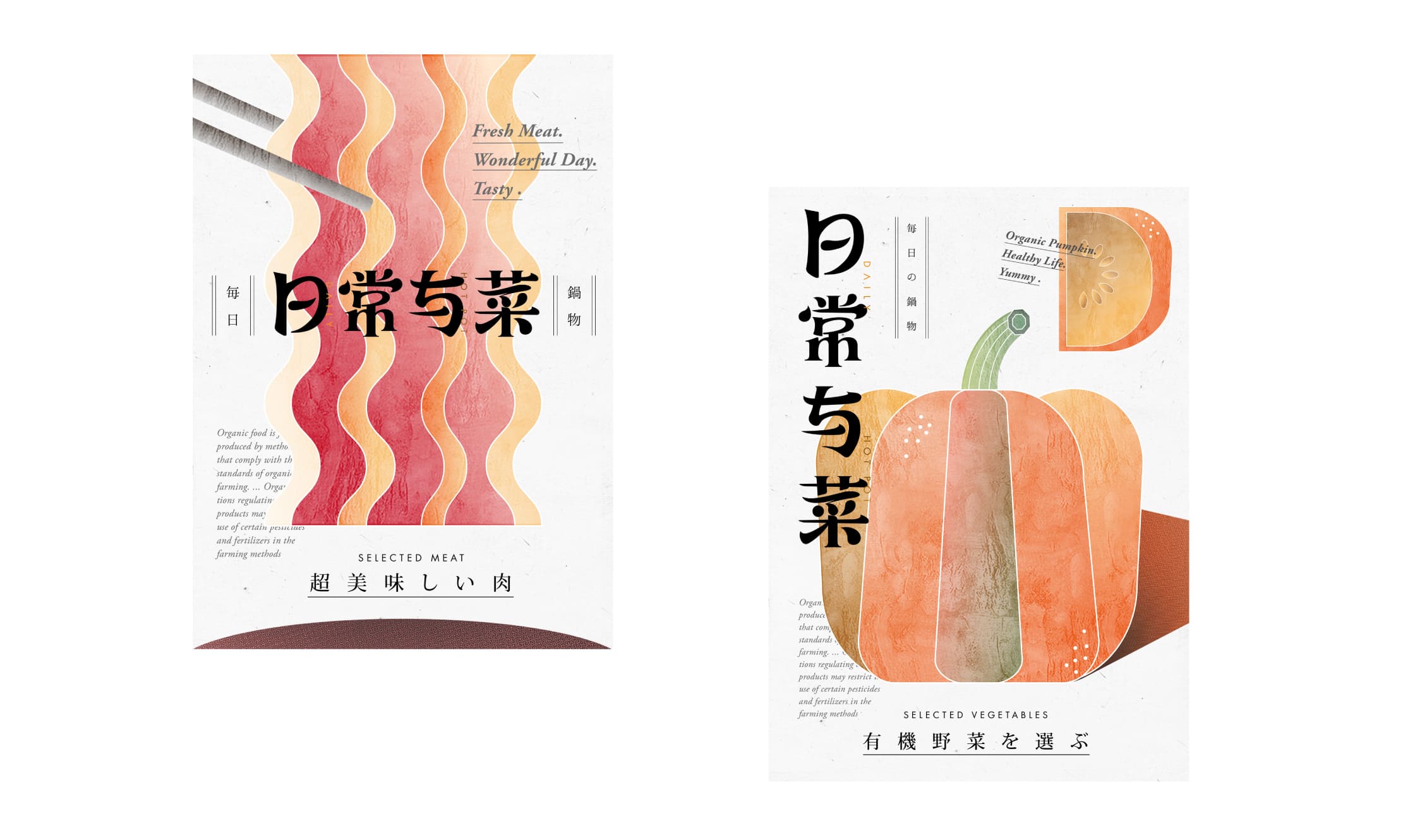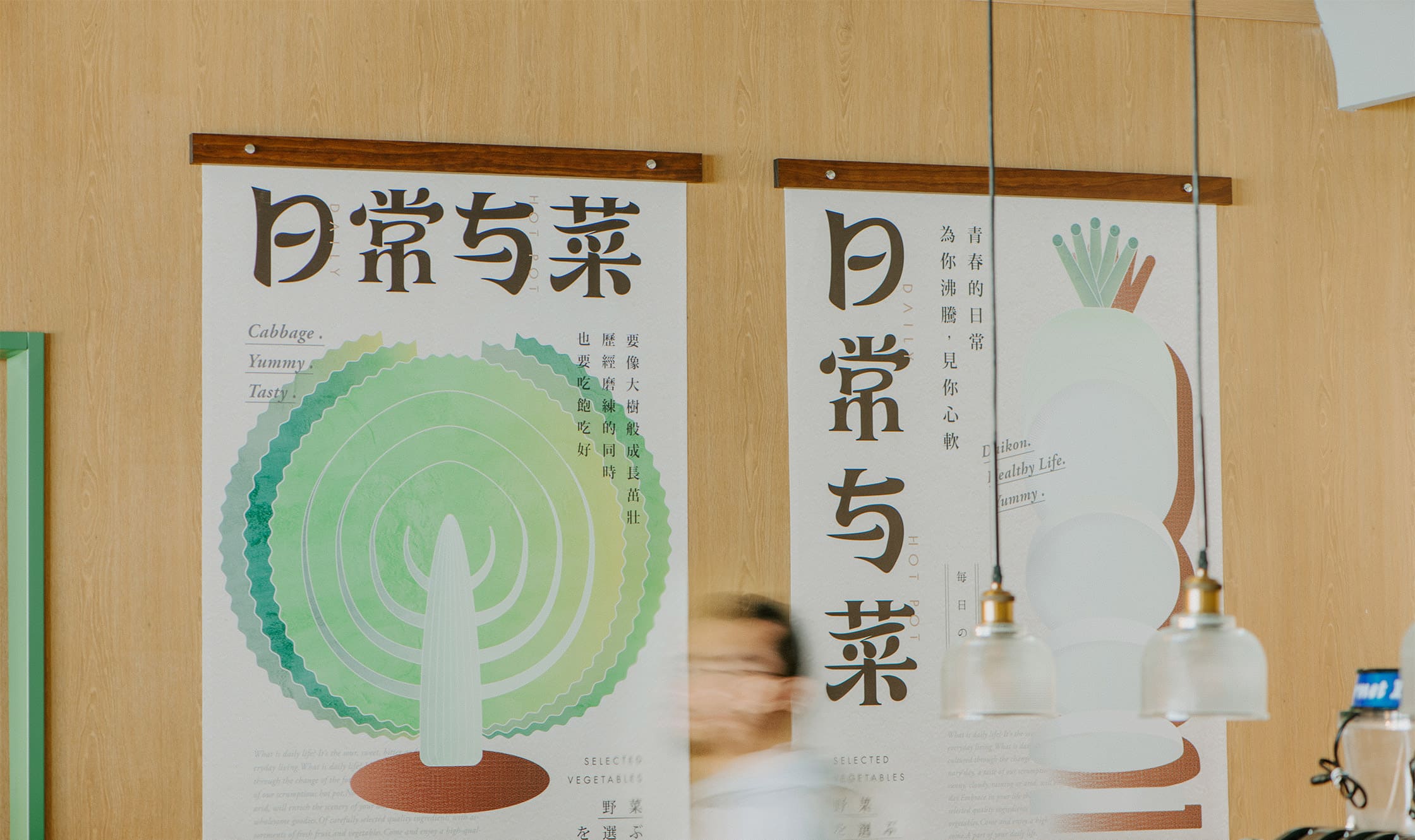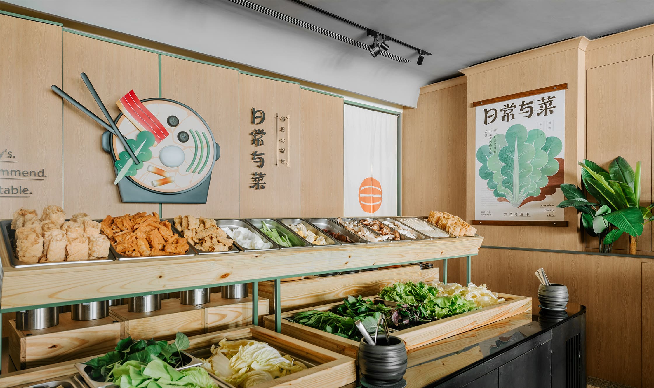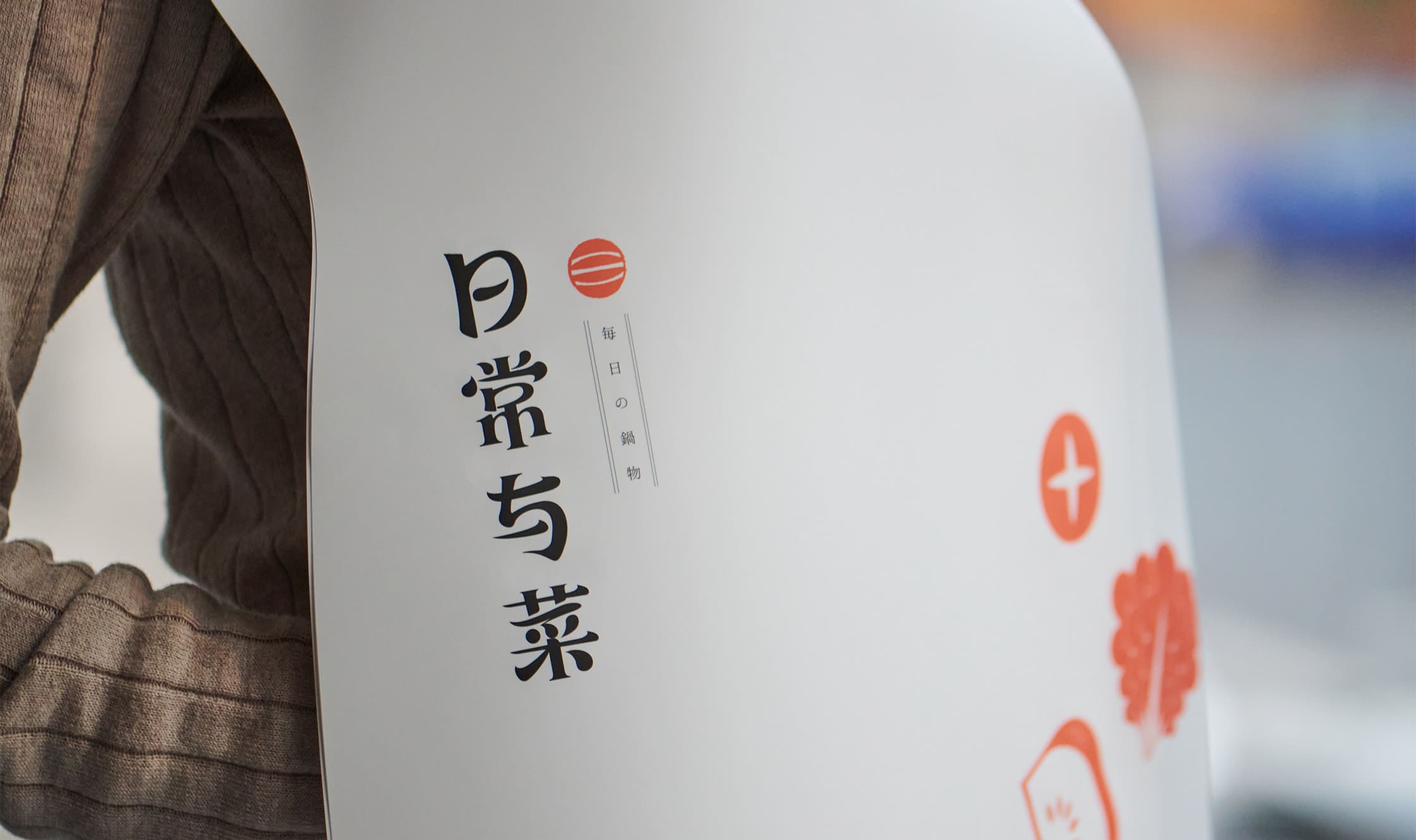 業者期望以鍋物也能吃得健康做為主軸,規劃出鮮蔬放題區,讓生活的每一天有肉、有湯、又有吃不完的野菜。因此,我們將品牌從日子裡的陪伴出發,順應一年四季,無論天冷、天熱,只要是用餐時刻「日常与菜」都在這兒。
