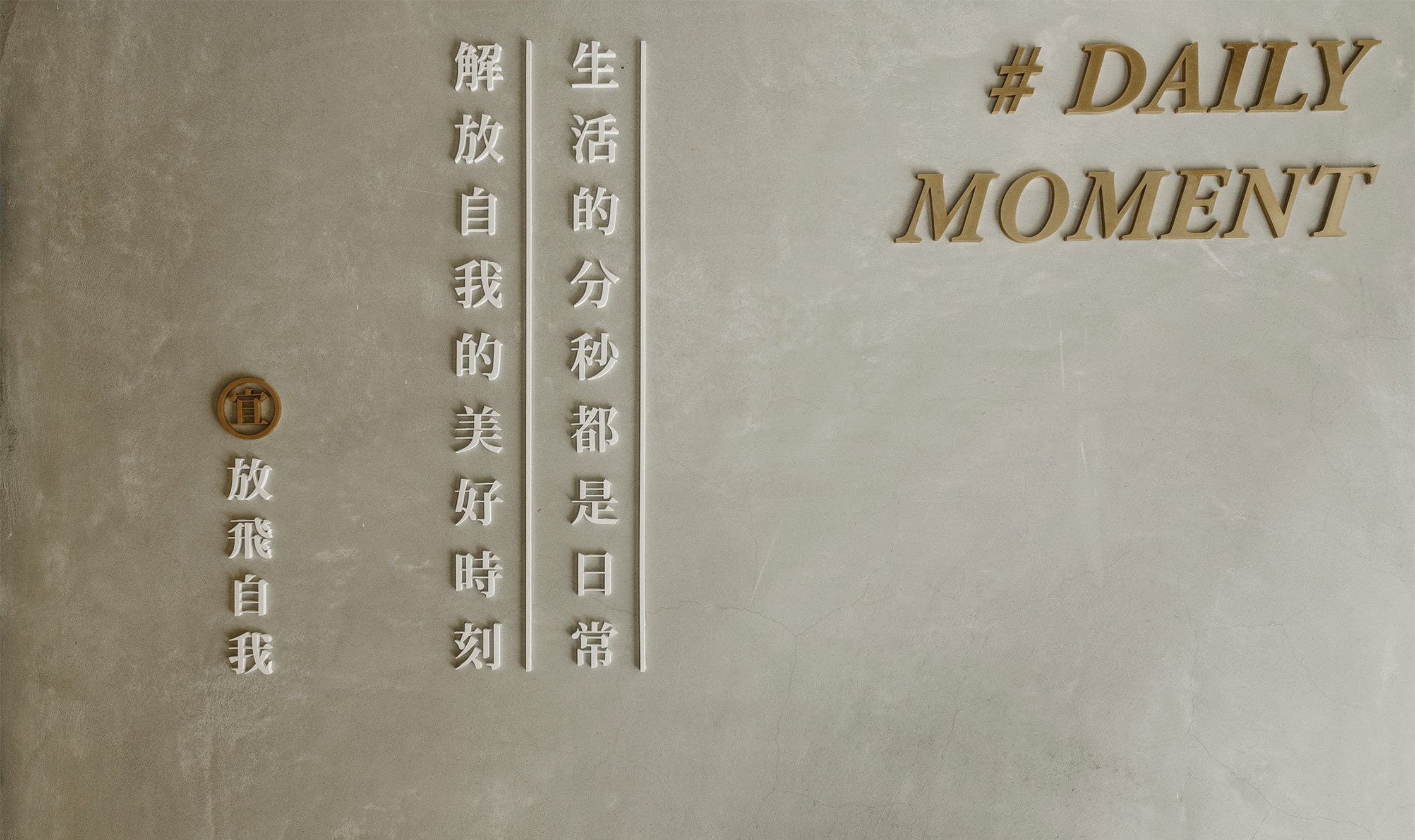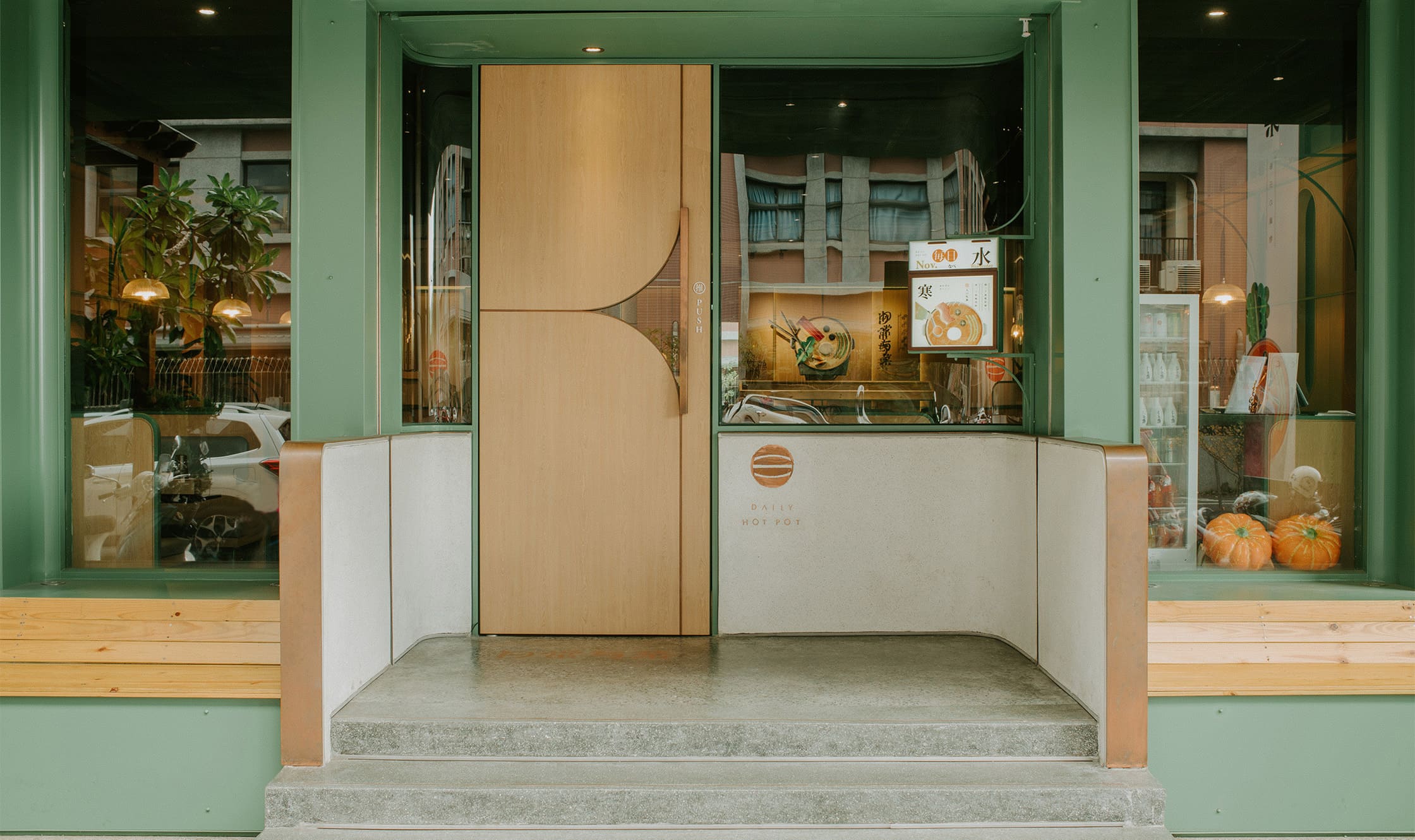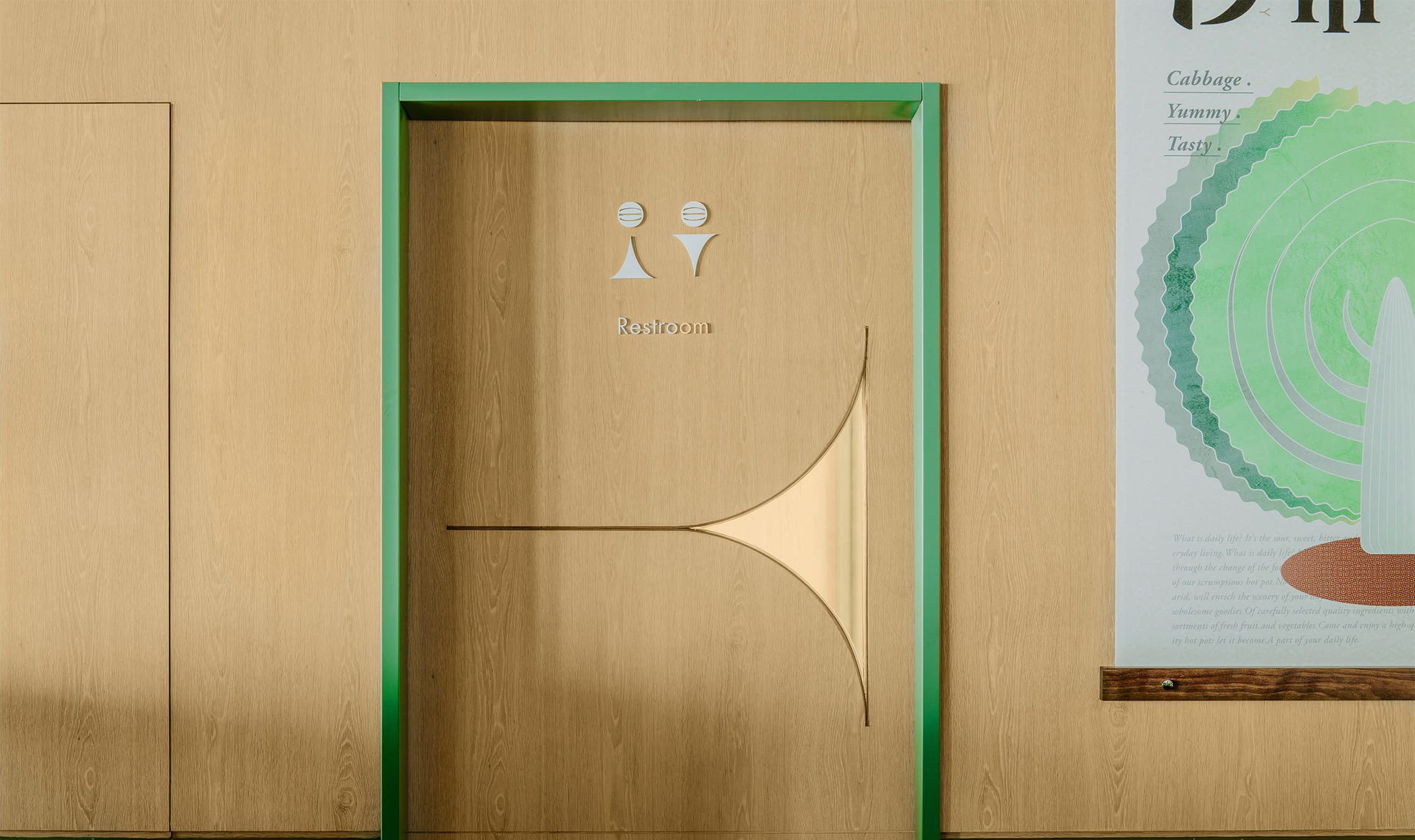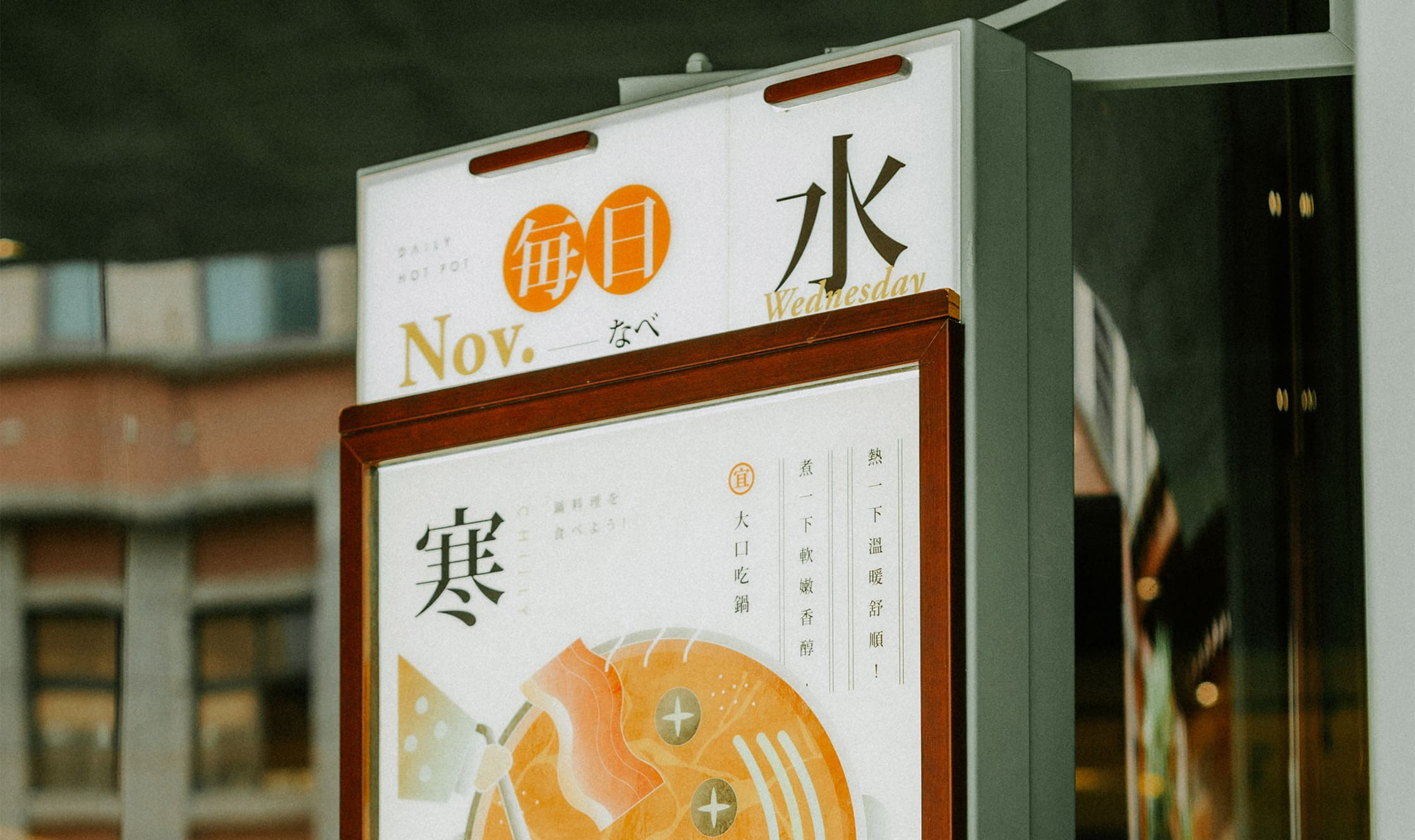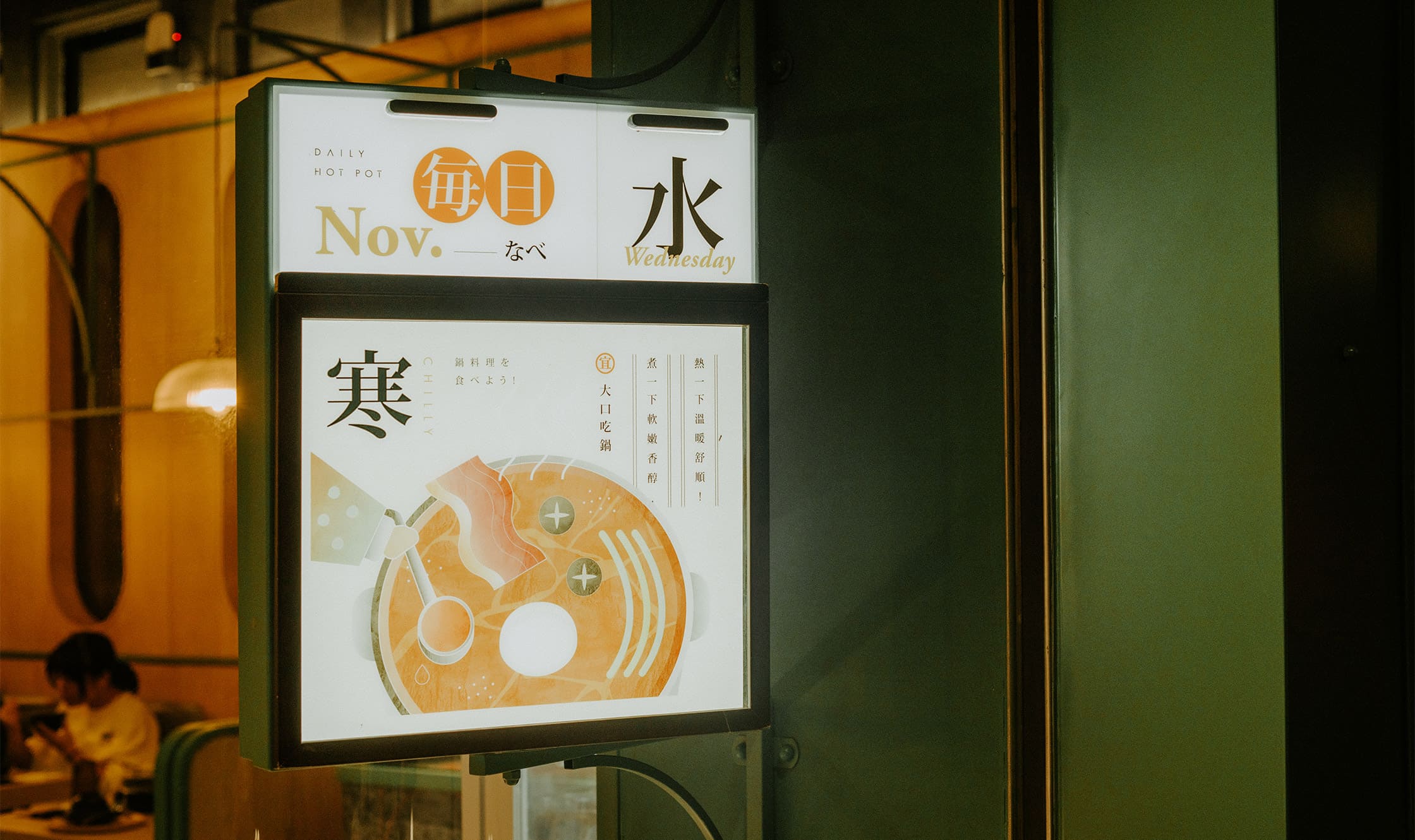 設計團隊思考將每天的生活感自然融入品牌裡,因此發展出有趣且具有儀式般的日曆燈箱,放置在正面入口處作為與客人互動的招牌,讓業者可以自行依照時序更迭、季節氣候來替換,並搭配著每天吃鍋心情的趣味梗。同時,在鮮蔬放題區採用立體大型火鍋視覺抓住客人目光,使人一入門就胃口大開。更在VIP包廂區域融入每天採購的藤編提籃作為形象展示,讓生活概念完全融入品牌的用餐體驗中。