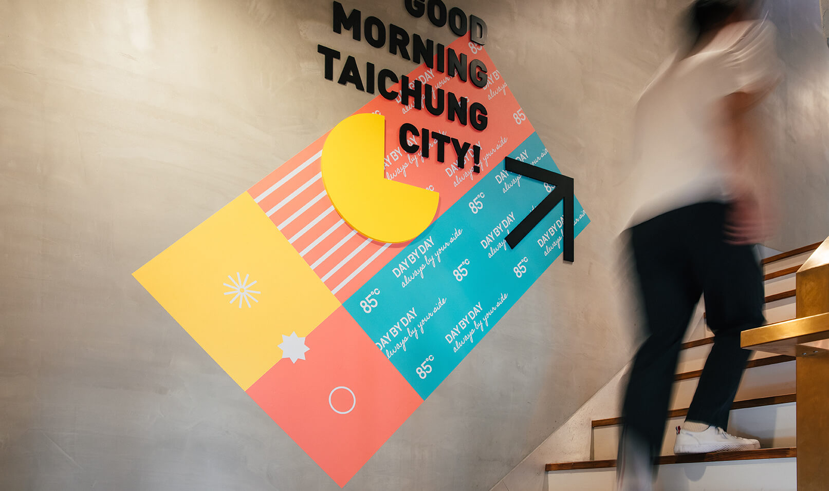 新店型所販賣的主要商品也與現有的產品線有很大的不同,以明亮顏色與富有動改感的幾何圖形來構成清爽及新穎的意象,也呈現出更強而有力的符號系統。攝影氛圍也特別營造出生活調性來強化品牌意象。同時也運用擅長的視覺延伸能力,將平面的元素鋪呈於室內空間,更增添出視覺一致性的風格。