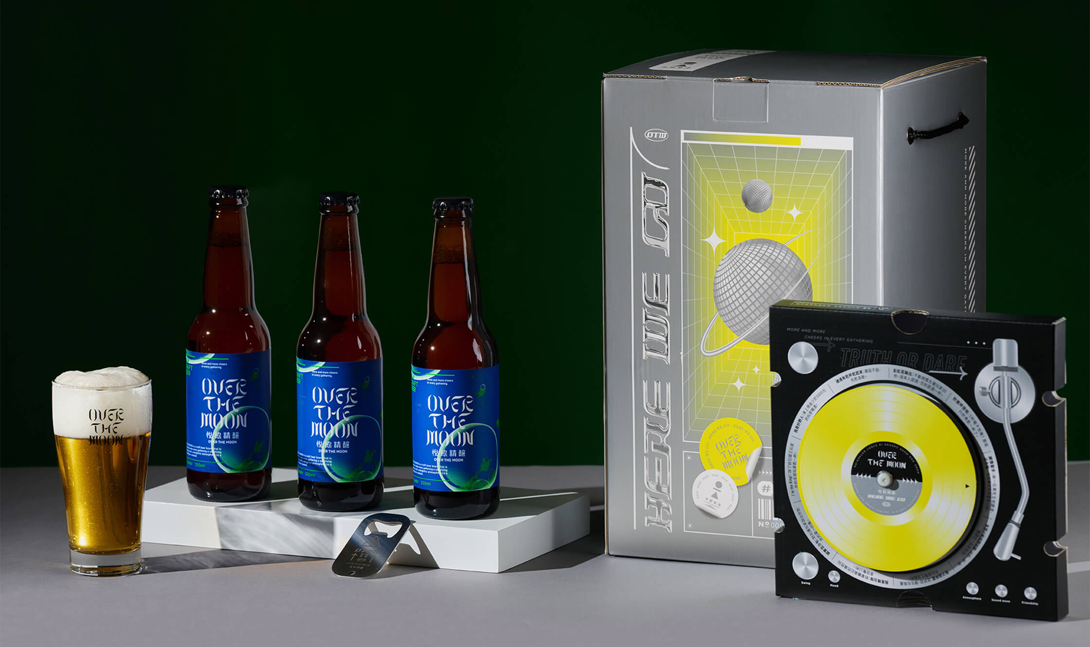 “Over the moon 悅飲精釀” 是一支2021年成立的精釀啤酒品牌 ,完全為了相聚愉快的時刻所生的精品啤酒,從命名開始; 來自英文諺語中表達十分開心愉悅的心情,傳達出品牌想帶給人們-越喝越愉快的品酒微醺感受。在品牌字體筆畫設計取自月亮陰晴圓缺的變化,具有強烈的辨識度。同時關於禮盒的設計上,團隊也是全力構想了在好喝之外帶有可以玩的趣味企劃,從打開禮盒的第一步,自行組裝出一個小巧的"悅盤" ,可以用於微醺之中的大冒險遊戲指南,更增添團聚中的樂趣,禮盒中附贈了品牌對杯與開瓶器,讓味覺與視覺獲得大大的滿足。