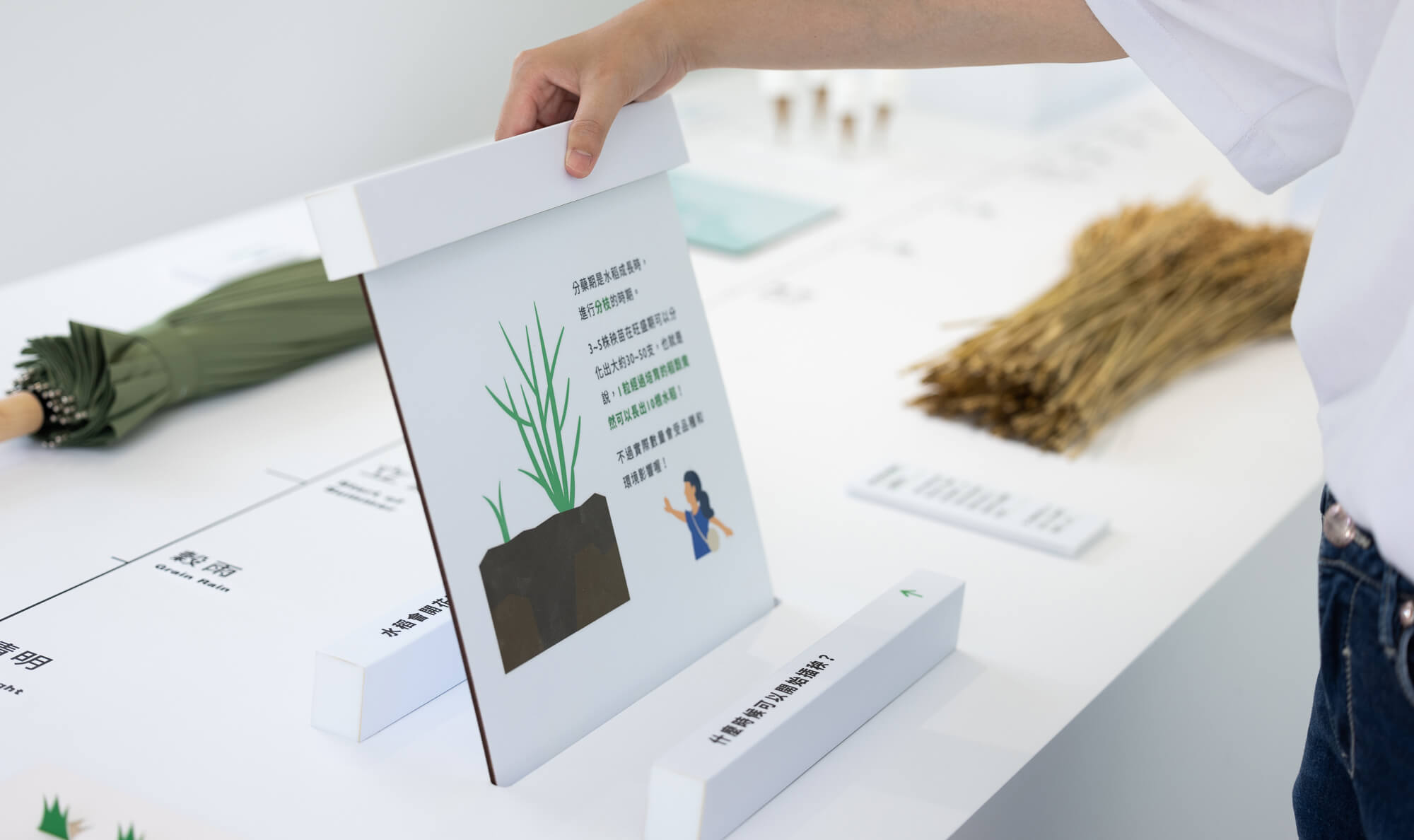 此展覽主要展區分為兩區塊,族群希望透過親子互動能夠讓下一代與土地的歷史與脈動更加緊密。第一區塊設定為人與稻米皆是生長在這塊土地之上的萬物,展桌上一分為二的展的展品讓觀者了解人們與稻米在四季更迭之中不同生命旅程。團隊特設定展桌上的展品可以拿取觸摸互動,讓孩子們透過有趣活潑的方式了解這中間的自然土地。