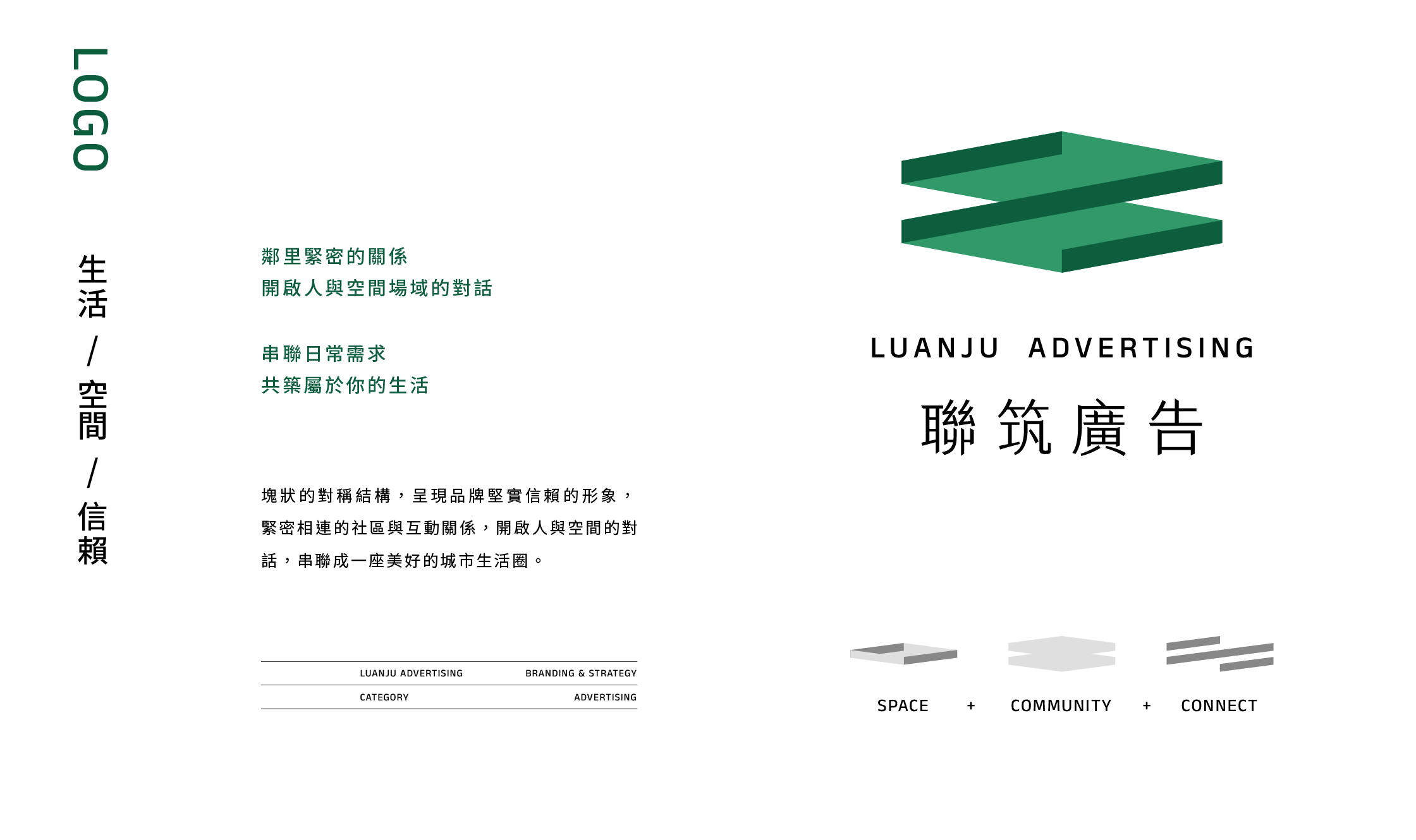 聯筑廣告作為房地產專業之廣告公司,我們深知建設產業與每個人的生活最為息息相關,良艮團隊在全面性的思考下,導入空間與人之間關係的詮釋,在眾多眼花撩亂的廣告視野中,也需要一個更加清晰的形象。 我們使用了非常簡潔的元素來描繪一個具有多重意象的圖騰。